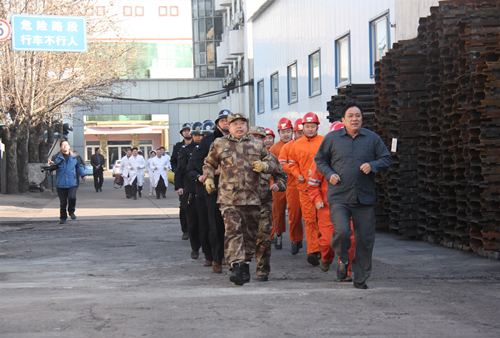 演练模拟场景为14时00分,矿支架工区废料库着火,火势逐渐增大,有向车间蔓延的趋势。调度指挥中心接到通知后,立即安排支架工区当班人员撤离危险区域,并采取应急措施进行灭火,然后按规定向值班矿领导、矿长以及上级有关部门汇报。14时04分,张矿长到达调度指挥中心,听取调度员汇报后,宣布成立救援指挥部,启动应急预案响应,拉响地面火灾警报。14时09分,近320人组成的应急救援小组集结待命,由总指挥分派任务后,各专业组迅速奔赴指定地点展开工作。14时12分,现场抢救组救护队员、消防员奔赴支架工区火灾事故现场进行灭火。14时22分,现场抢救组组长汇报,火势已扑灭,无人员受伤。14时25分,总指挥宣布应急演练结束。