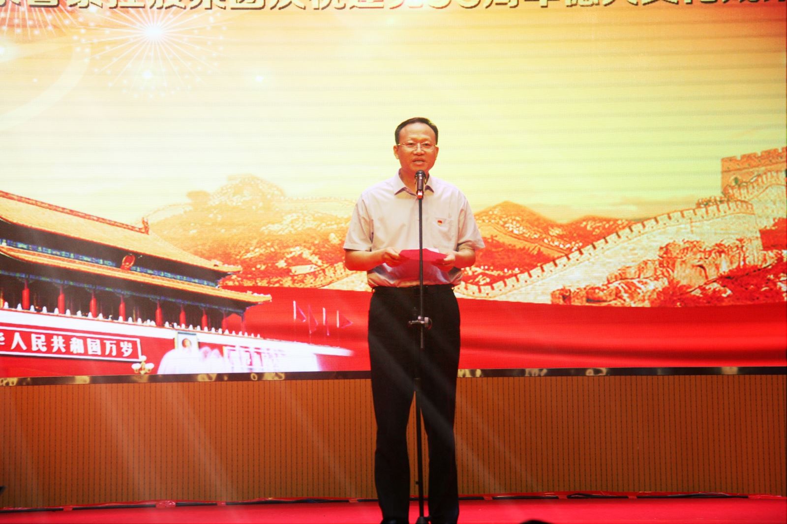 红色的情怀,激情的演绎。演出在舞蹈《山丹丹花开红艳艳》拉开序幕,充满浓厚陕北风情的舞蹈,打开了记忆之门,仿佛又把观众带到了那个热血沸腾的年代。歌曲 《东方红》、情景剧《36天的奇迹》、舞蹈《党旗飘飘》、小品《要听党的话》、戏曲联唱《金典记忆》、舞蹈《回族姑娘》、歌曲《新走西口》、舞蹈《缅桂花开献给党》、歌曲联唱《微山湖》《敖包相会》《花儿与少年》《泪蛋蛋泡在沙蒿蒿林》、舞蹈《碧波孔雀》、歌曲《以鲁泰的名义》、小品《暖心》、音乐快板《竹板声声赞"德兴"》、诗朗诵《"德兴"文化赞》、小品《原来如此》、歌伴舞《共圆鲁泰梦》,一个个精彩的节目,博得在场观众阵阵掌声。演出在歌曲《不忘初心》中结束,歌声大气磅礴、委婉动听,让人重温共产党人用生命和热血铸就的雄壮历史,重温革命先辈用理想和信念丈量的伟大远征,将整场演出推向高潮。