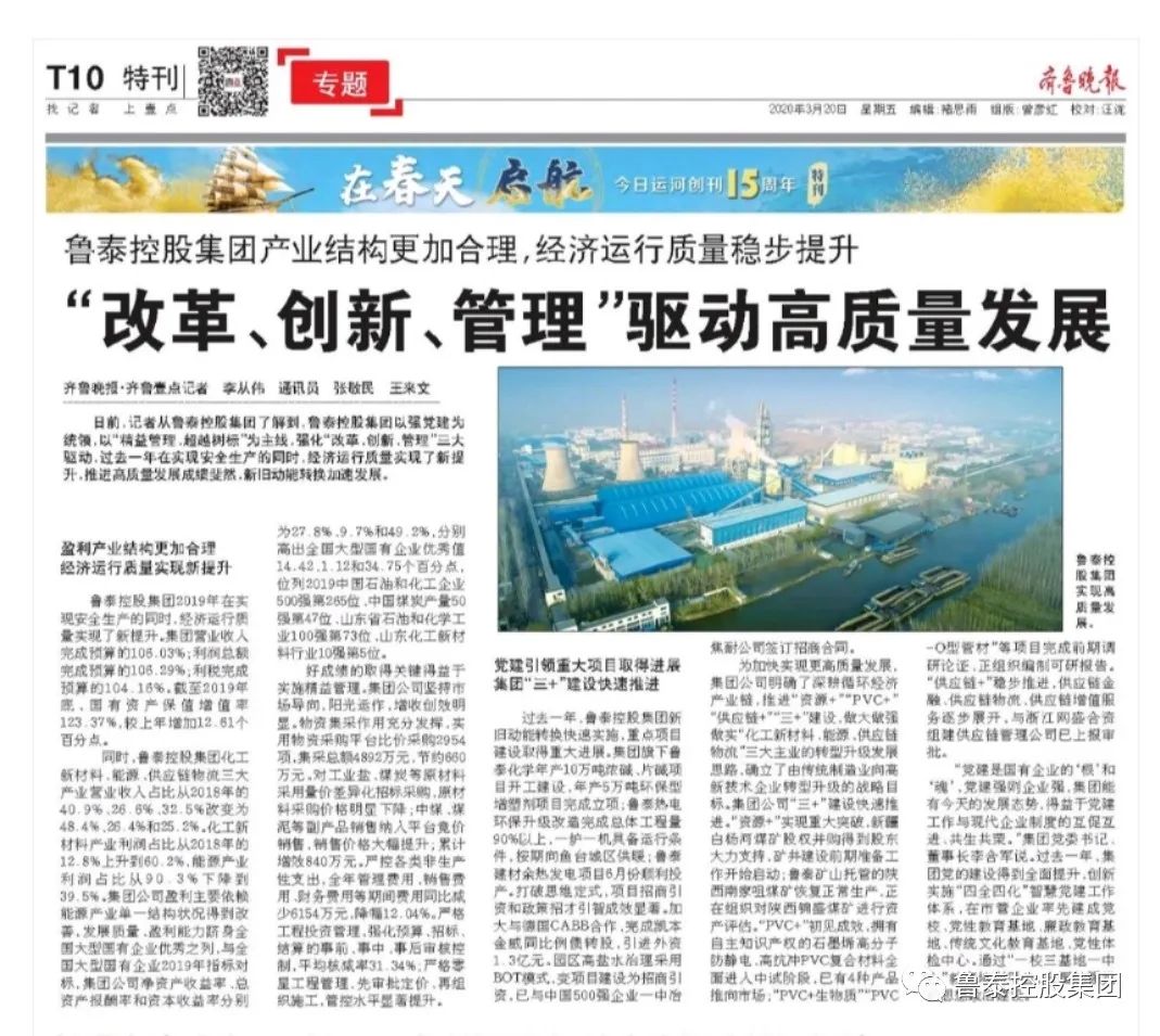 日前,记者从鲁泰控股集团了解到,鲁泰控股集团以强党建为统领,以“精益管理、超越树标”为主线,强化“改革、创新、管理”三大驱动,过去一年在实现安全生产的同时,经济运行质量实现了新提升,推进高质量发展成绩斐然,新旧动能转换加速发展。